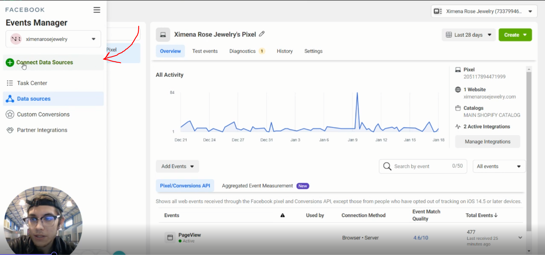 Click on events manager and choose "Connect Data Sources".